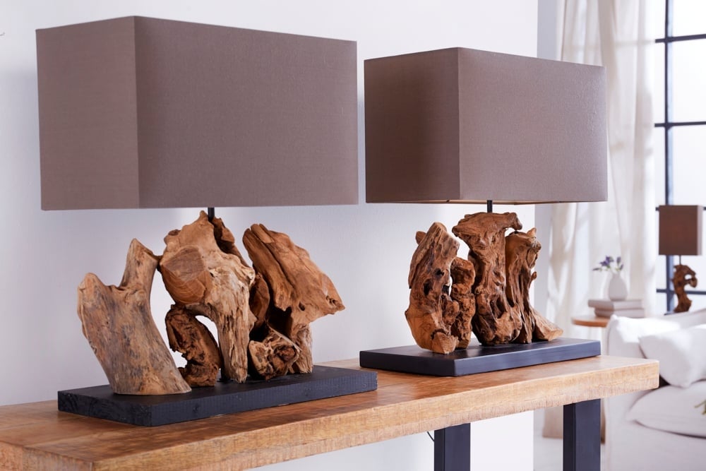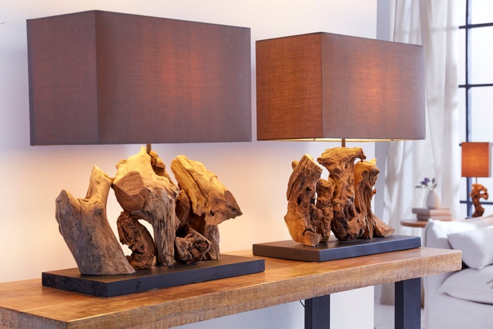 Lampe de table faite main ARAGON 50cm base en bois flotté marron avec abat-jour en lin - 20694